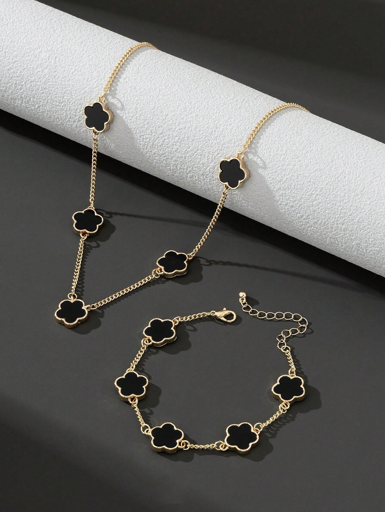 The Clover Combo Set pairs a gold-tone necklace and bracelet, each featuring bold clover motifs – symbols of grounded strength and elevated presence. Wear them together for maximum impact or solo for subtle flex. Available in black and green.